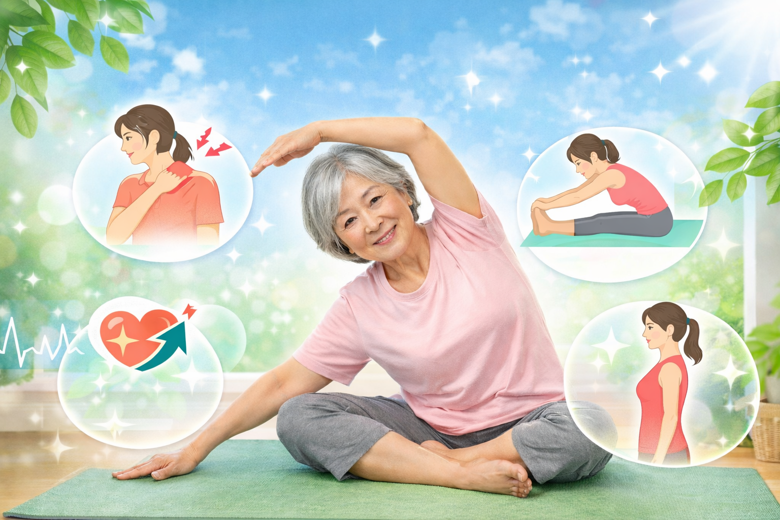 激しい運動ではないため、運動が苦手な方やシニアの方でも無理なく始められる健康習慣として人気があります。筋肉を伸ばすことで血流がよくなり、体の疲れを回復させる効果も期待できます。